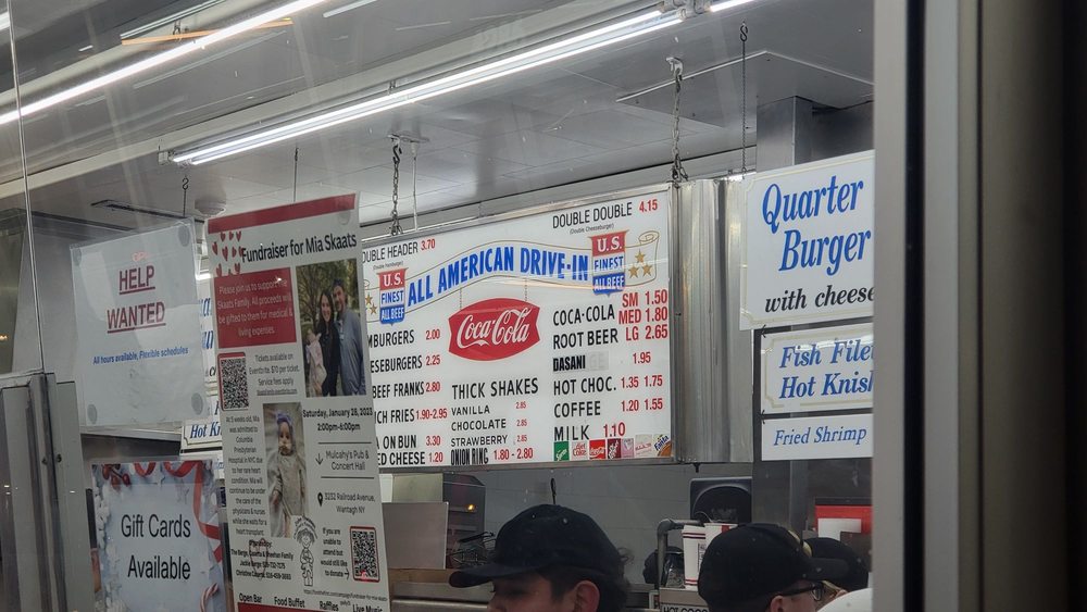 Introducing the menu at All American Hamburger Drive-In, a legendary fast food burger joint in Massapequa, NY. Offering classic options like Double Cheeseburgers, Quarter Pounders, Hamburger, and Cheeseburgers, along with unique additions like Fish Filet, Tuna on a Bun, and Butterfly Shrimp. Satisfy your cravings with tasty sides like French Fries, Onion Rings, and Hot Knish. The customers rave about the delicious burgers, quick service, and affordable prices. Don't miss out on their shakes, fried shrimp, and nostalgic atmosphere. With a simple menu, efficient service, and a long-standing reputation, this old-school drive-in is a must-visit for burger enthusiasts looking for a taste of traditional American fare.